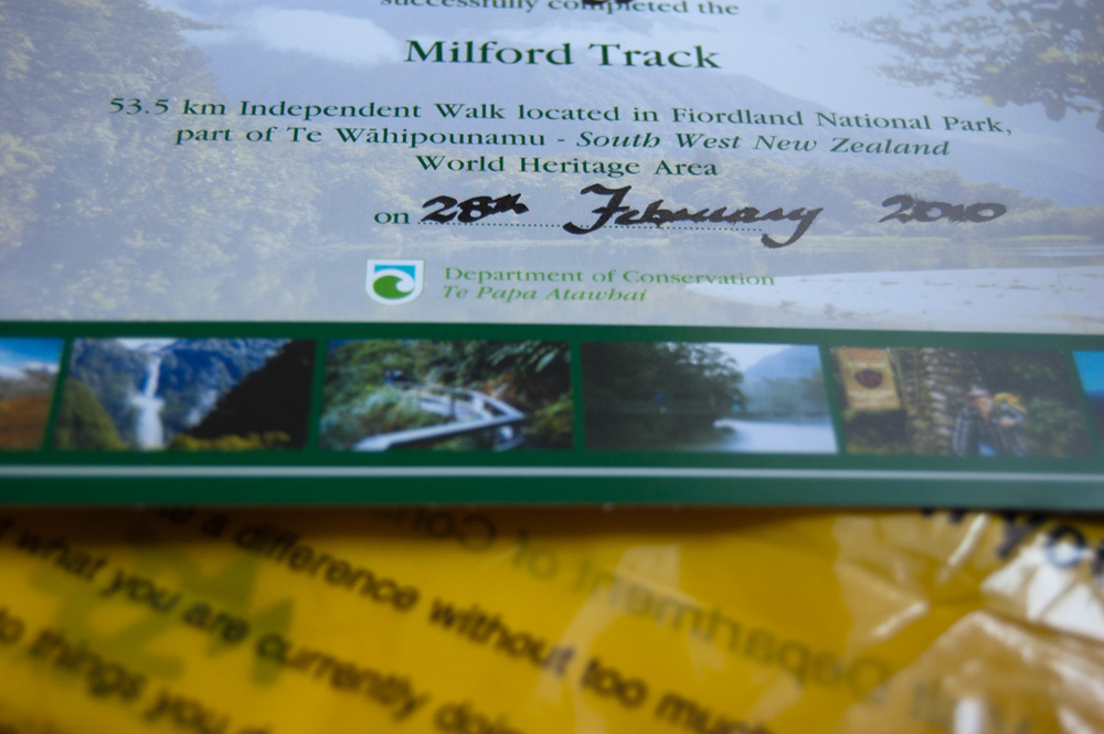 iSite pro diplomy za absolvování Milford Tracku. Sice je to jen další kravinka, jak vytáhnout z turistů ještě nějaký ten dolar, ale co už. Doplňujeme nádrž (máme pořád divnou spotřebu) a jedeme do Queenstownu. Počasí humus. U odbočky (¤) k jezerům Mavora Lakes ani nezastavujeme a to jsme se tam chtěli zajet mrknout, poblíž se natáčel "Les Fangorn" z Pána Prstenů. Projíždíme pár vesniček. V Atholu (¤) je moc hezky udělaný interiér obchůdku se "smíšeným zbožím" - káva, jídlo, suvenýry, info atd. Na předměstí Queenstownu hledáme odbočku(¤) k Deer Heights, kde je opět pár míst z natáčení Pána Prstenů, třeba scéna ze Dvou Věží, kdy vrrci útočí na rohanské jezdce. Končíme u brány s nápisem "Private Road", chvíli šmejdíme okolo ale bez výsledku. V průvodci píšou, že tam nějaký přístup má být. Ale stejně děsně leje. Pokračujeme do centra Queenstownu, kde je zase neskutečný provoz aut a hledat místo k zaparkování je jako rýžovat zlato v městské stoce. Po nalezení DOC info centra(¤) a vyzvednutí lístků na Routeburn Track jdeme do mexické restaurace, kde si objednáváme Take Away (jídlo s sebou) Nachos a